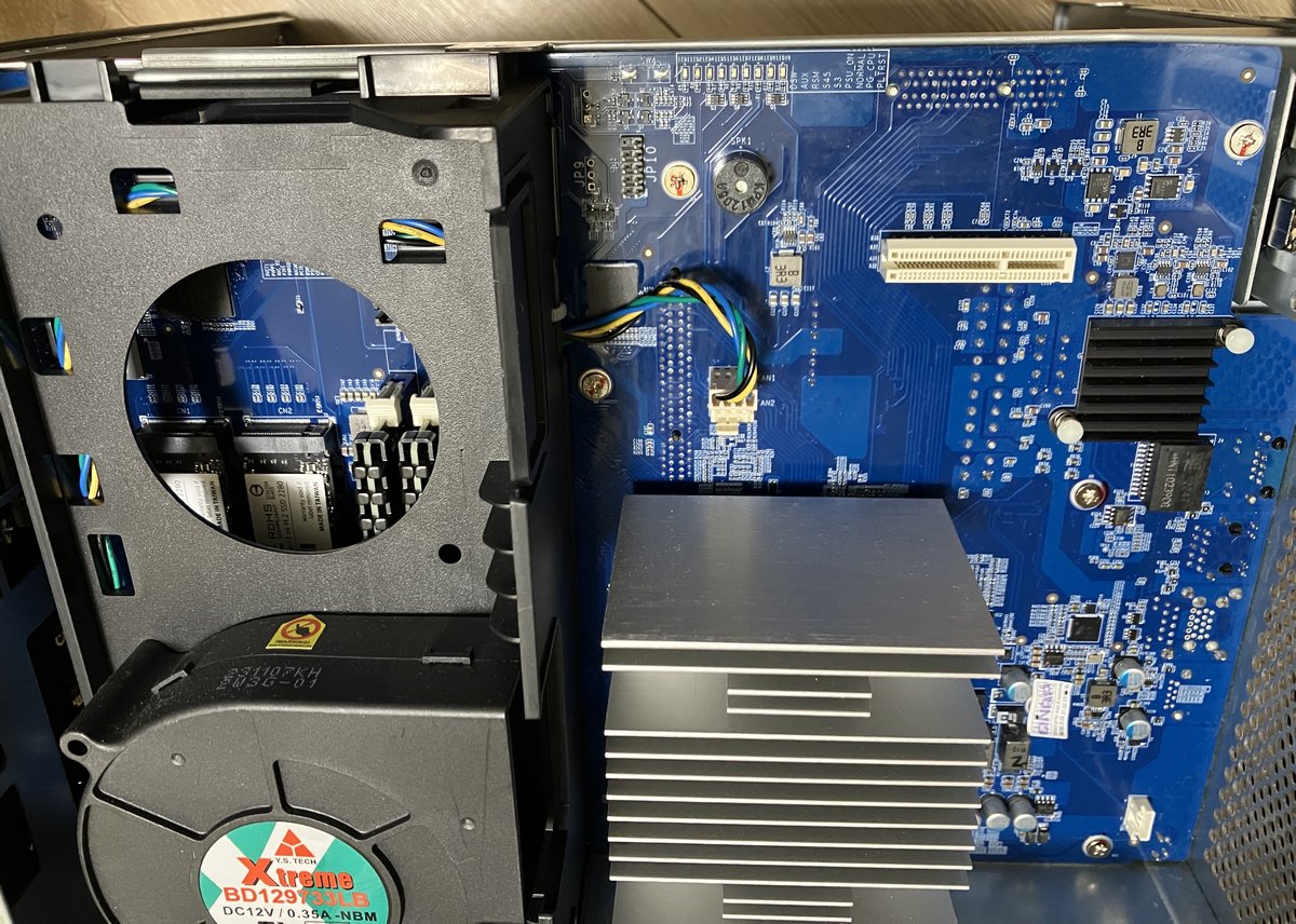 從內部機板照可以看到,TS-855X 採用了巨大的被動式散熱鰭片覆蓋在 Intel Atom C5125 處理器上。