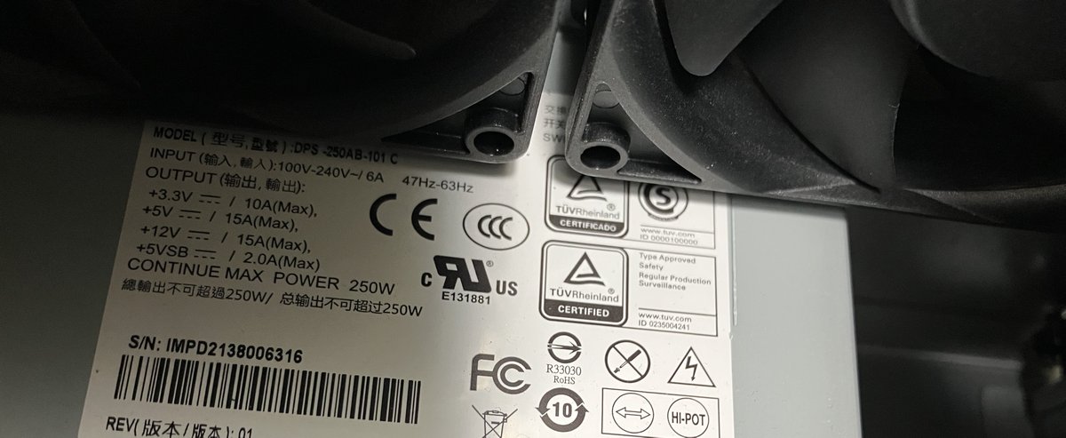 電源供應器特寫顯示這款機器採用的是 Delta (台達電) DPS-250AB-101 C,額定功率 250W。台達電是伺服器 PSU 的龍頭,選用它的電源供應器是有不錯的用料和品質。對於一台裝滿 6 顆機械硬碟、2 顆 SATA SSD 與 2 顆 NVMe SSD 的機器來說,250W 提供了充足的餘裕(Headroom),確保在硬碟同時啟動(Spin-up)的瞬間電流不會導致系統不穩,這是企業級 NAS 的標準設計。