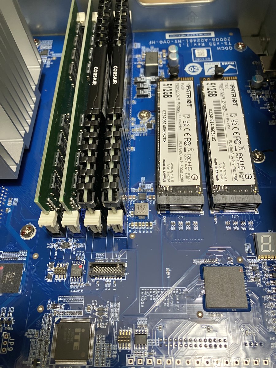 在 M.2 插槽上 ,實際使用了兩條 Patriot P300 512GB SSD,它們是 PCIe Gen3 x4 的 M.2 SSD 。雖然市面上 Gen5 和 Gen4 已是主流,但 TS-855X 的 M.2 插槽規格雖然是 PCIe Gen3 x4,但在這樣的機器上已經很夠用。
