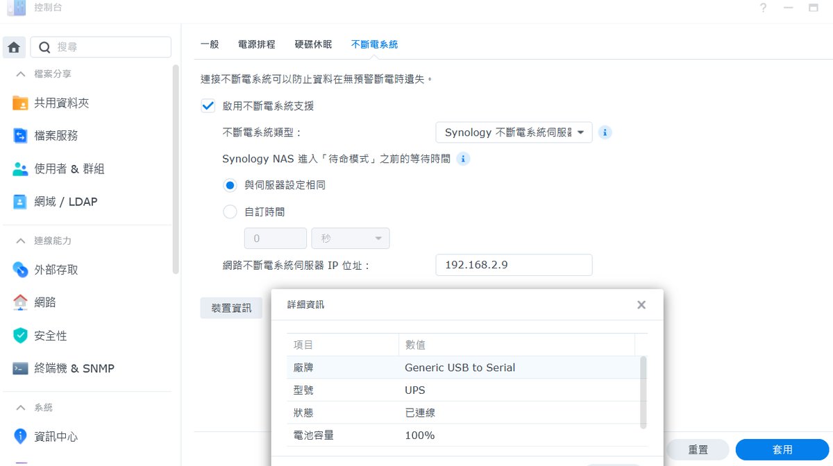 所以會需要另外起一個不同的 UPS Server ,本案例是做在環境中的 PVE 伺服器上,做完之後,再進入S ynology 管理介面的 [控制台] > [硬體與電源] > [不斷電系統]。