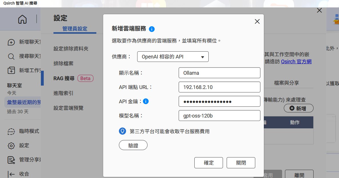 CyberQ 實際測試也可以另外有一台 AI 推論效能更強的伺服器跑 Ollama 之類的服務提供與 OpenAI 相容的 API ,同樣能在 QNAP 的 RAG 中被導入使用,增添了更多彈性。