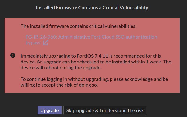 對於使用 FortiGate 的企業用戶,特別是跨越 7.0 至 7.6 版本的管理者,本次更新一定是務必要進行的,從 FortiGate 統一推送給各用戶在管理介面的緊急提醒,可見事態之嚴重性,如下圖所示。