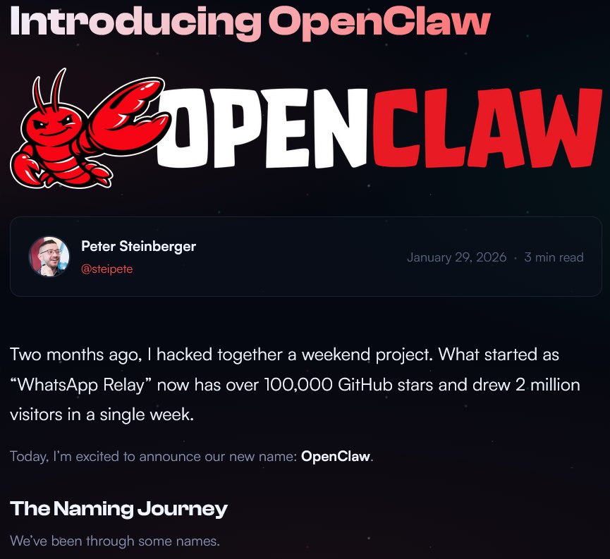 這場更名風波始於專案最初的名字 Clawd 因發音過於接近 Anthropic 的旗艦模型 Claude 而收到商標警告。專案發起人 Peter Steinberger 迅速將其改名為 MoltBot,取龍蝦「脫殼」(Molting)成長之意,象徵專案在壓力下反而更加強大。