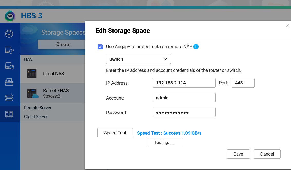 設定完成後,回到 HBS 3 的儲存空間列表。你會看到遠端 NAS (RemoteNAS-TS855x) 的狀態欄出現了一行紅色的 Protected by Airgap+ 字樣。這代表 HBS 3 已經成功接管了交換器對該 Port 的保護和連網控制權。