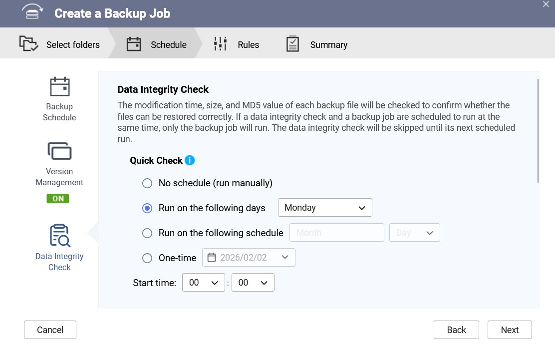 平常固定自動離線備份給它的大量備份資料,也可以透過 QNAP NAS 中的資料檢查確認機制自動化去檢驗校對,也相當方便,如下圖所示。