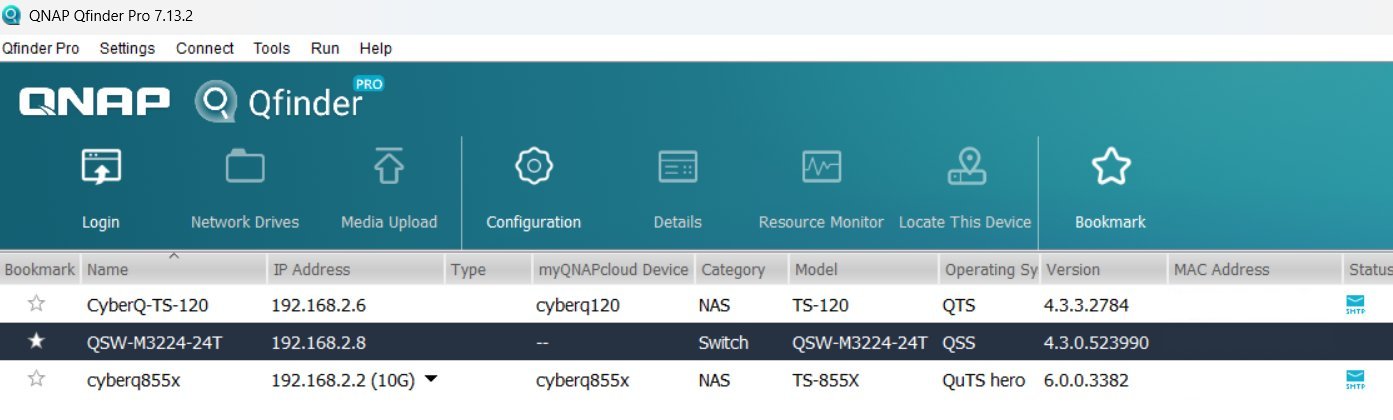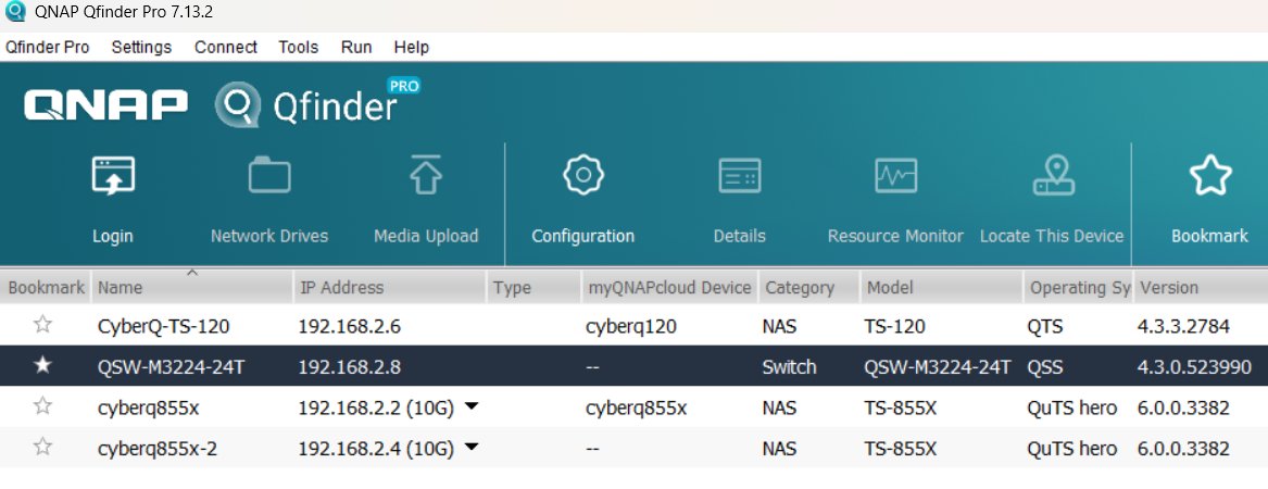 透過 Qfinder Pro,我們可以看到架構中的所有設備,包括負責調度流量的 QSW-M3224-24T 交換器與兩台 TS-855X NAS。