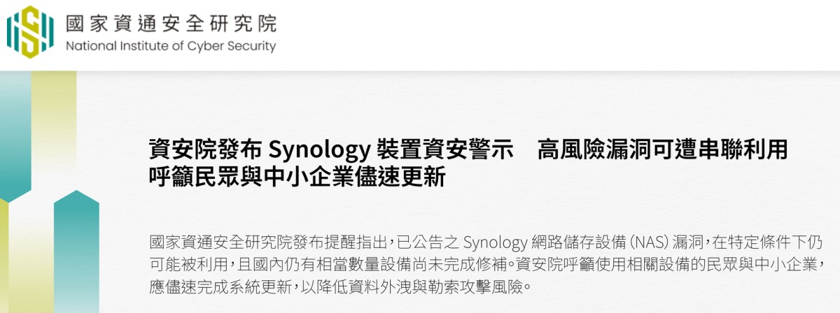 如果您家裡或公司使用的是 Synology(群暉)的 NAS 設備,現在是時候登入後台檢查更新了。近期針對 Synology NAS 的資安威脅呈現「雙重夾擊」的態勢。一方面,國家資通安全研究院(資安院)日前也發出緊急警示,指出台灣市場上仍有超過一千台 Synology NAS 尚未修補 2024 年的高風險漏洞,且攻擊程式已在網路上流傳。另一方面,根據群暉官方網站的更新說明,修正了有關 telnetd 的安全性弱點 (CVE-2026-24061),這個漏洞是有機會讓攻擊者取得最高權限(Root)的漏洞,已經修補,不過這個漏洞是 Linux 常用套件 GNU Inetutils 長達 11 年的 Telnet 服務重大漏洞。