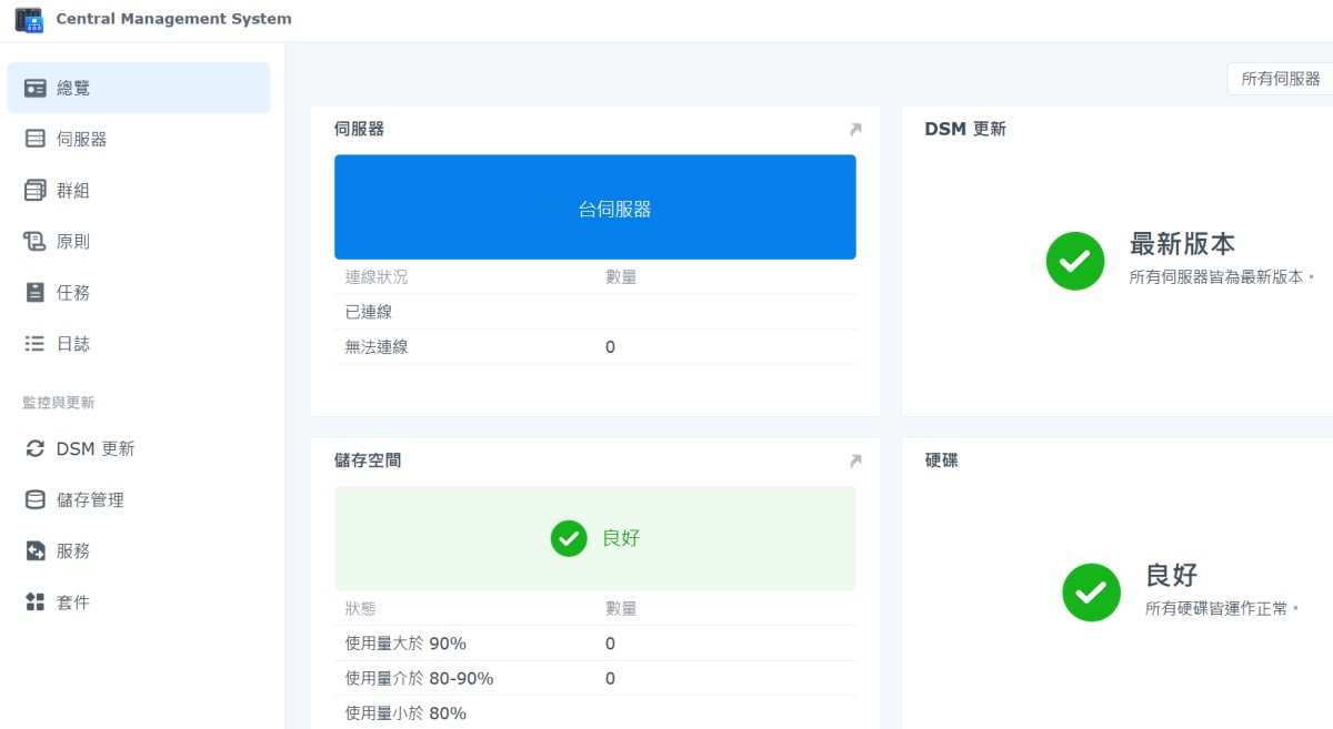使用 Central Management System 可以知道目前手邊每一台 Nas 伺服器的 DSM 版本是否更新到最新版,還有套件版本也可以設定監控來檢查更新狀態。