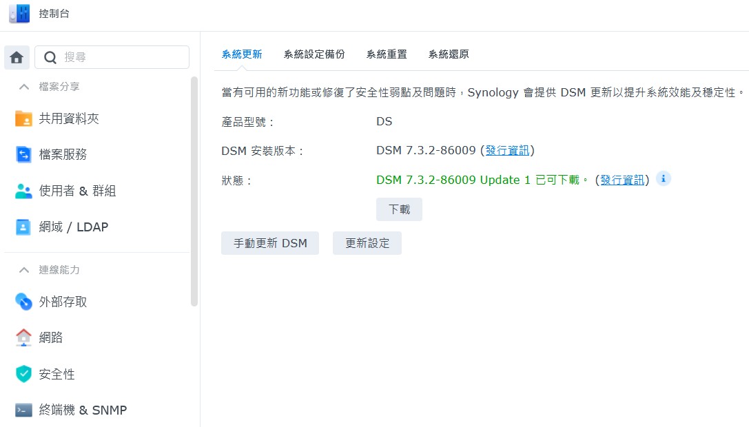 前往 「控制台」 > 「系統更新」,將 DSM 更新至最新版本(針對 Telnet 漏洞,請確保更新至 DSM 7.3.2-86009 Update 1 或更高版本)。