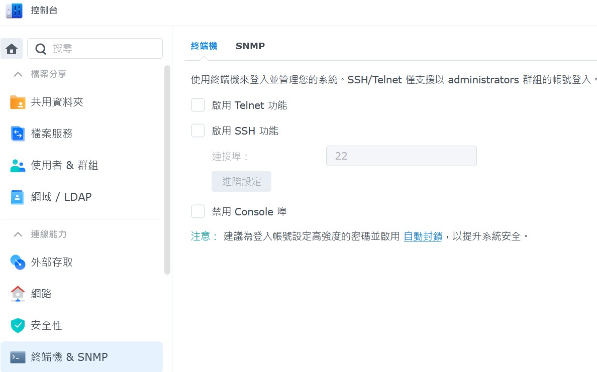 停用 Telnet,除非絕對必要,請務必在「控制台」>「終端機 & SNMP」中取消勾選「啟動 Telnet 功能」。建議改用較安全的 SSH,並設定非預設連接埠。