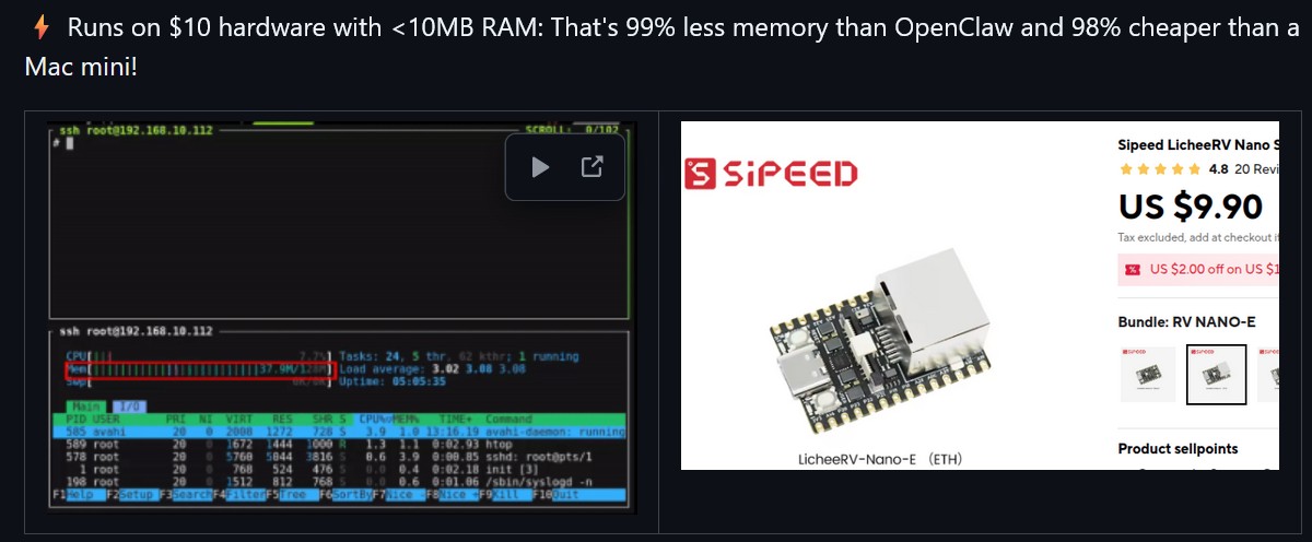 透過 Go 語言從零重構,PicoClaw 成功將常駐記憶體佔用壓縮至 小於 10MB,相較於傳統 OpenClaw 的核心功能,其資源消耗減少了驚人的 99%。這意味著,開發者不再需要動輒上千美元的設備,只需一塊市價約 10 美元 的單板電腦(SBC)或國產開發板,就能順暢運行專屬的個人 AI 助理。