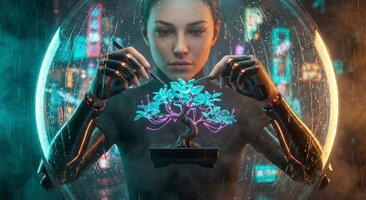 Concept: A biomechanical female botanist pruning a glowing, floating neon bonsai tree inside a spherical glass terrarium. It is raining heavily outside.