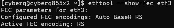 還有一個關鍵是 FEC(前向錯誤更正)設定, 從CyberQ 測試的畫面中,下指令 ethtool –show-fec 網路卡名稱,可以看到這款網路卡使用的 FEC 設定是 RS 模式,Reed-Solomon (RS) FEC 是一種強力的糾錯方式,常被用於高速傳輸中,例如 100GE 或 400GE 網路,我們在交換器中也能夠予以定自動 (Auto),交換器會根據連接埠的能力自動去調整,適合一般情況。