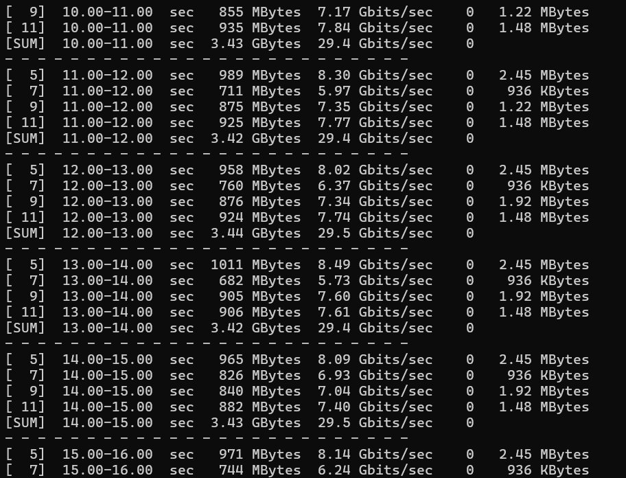 在初始設定下,我們直接透過 Docker 容器執行 iperf3 進行多執行緒(-P 4)測速,傳回來的資料就毫無意外地低,傳輸速度卡在 20.3 Gbps,完全上不去。且重傳次數 (Retr) 在短短 10 秒內,封包重傳高達 33,857 次。 壅塞視窗(Congestion Window, cwnd) 則縮水至 100K~300K 徘徊。