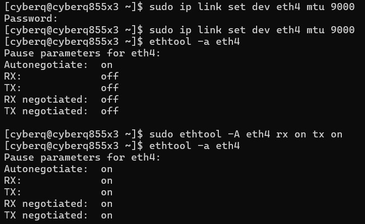 其次是強制啟用流量控制 (Tx/Rx Flow Control),在極高速的傳輸下,比較容易發生微爆發 (Microburst),導致接收端網卡或交換器的 Buffer 瞬間被打滿。下指令 sudo ethtool -A 網路卡名稱 rx on tx on,開啟雙向 Flow Control 後,設備在來不及吞吐時會發送 Pause 幀(暫停訊號)給對方,用等一下取代直接丟包,這是消除大量 Retr 的關鍵。