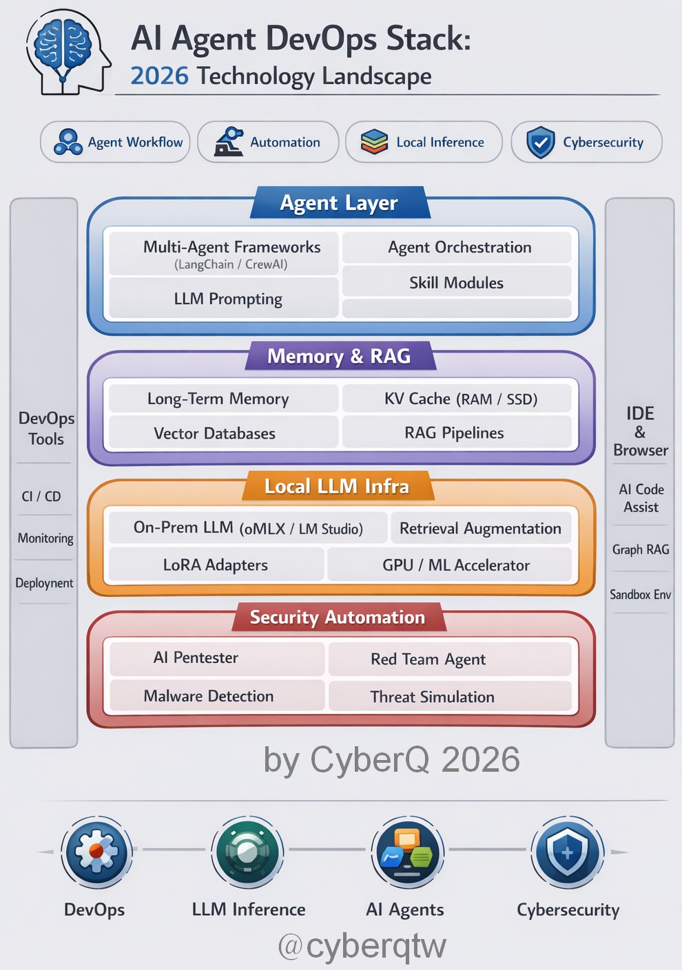 未來的開發與維運將由 Agent Workflow、Automation、Local Inference 與 Cybersecurity 四大支柱構成。本週的熱門專案,重點精準落在上方這張架構圖的不同分層中,各界逐步建構出未來的 AI 軟體工程工具鏈。