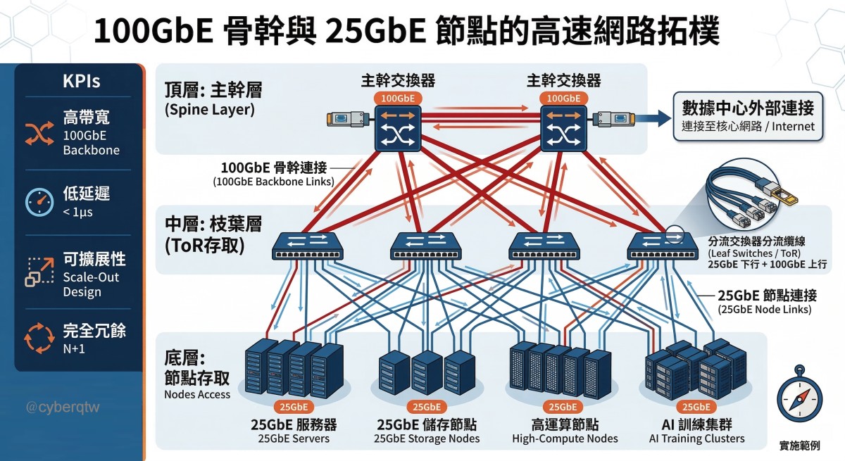 100GbE 骨幹搭配 25GbE 節點的高速網路拓樸