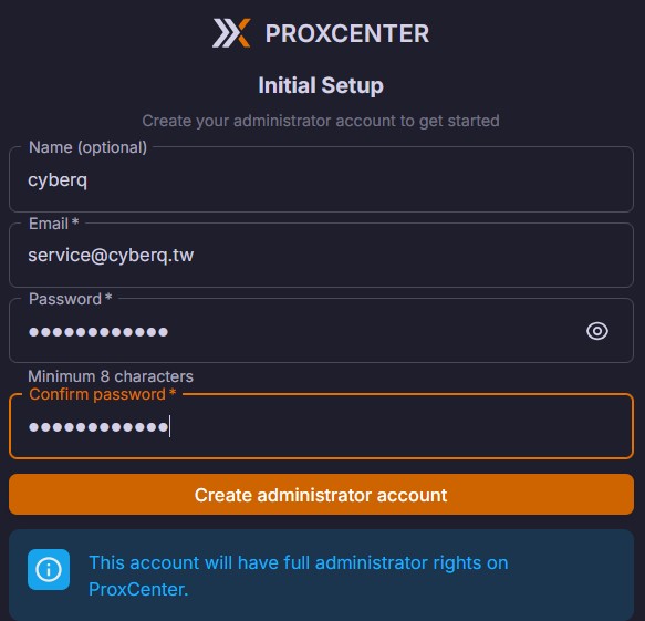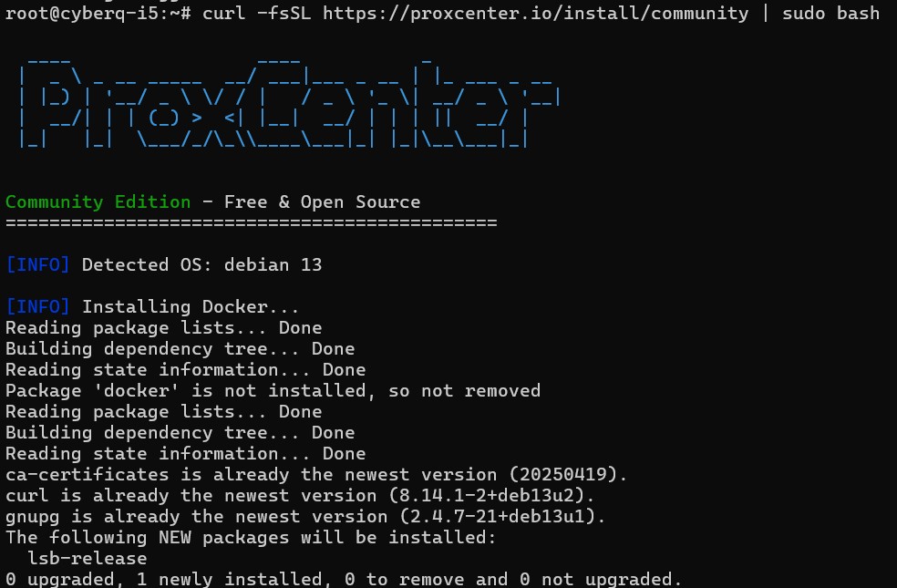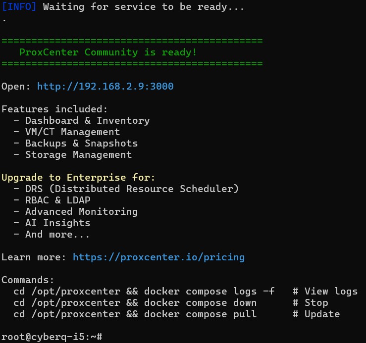 ProxCenter 的架構設計極為輕量且現代化。它完全依賴 Docker 與 Docker Compose 執行,只需要單一 3000 埠即可透過 HTTP 與 WebSocket 提供服務。官方提供了極簡的安裝腳本,CyberQ 實測與安裝,部署過程是相對簡單的請參考: