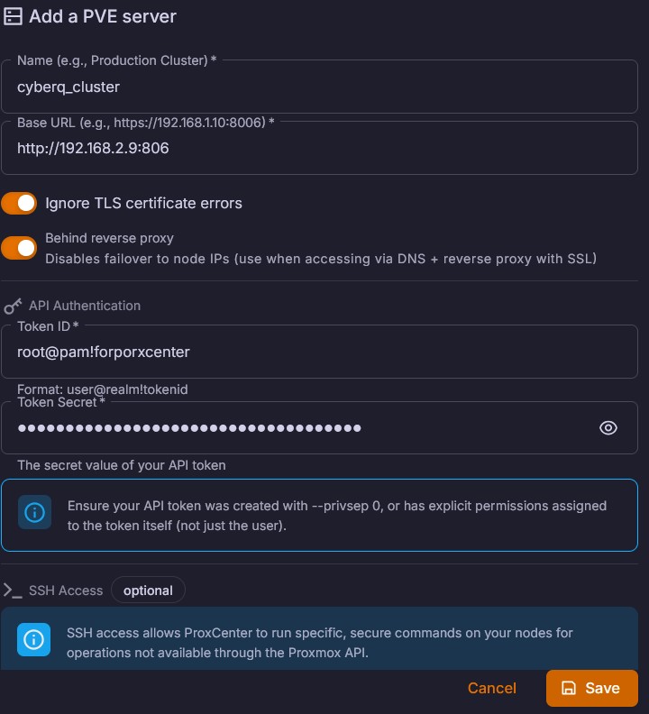 接著要設定連接你的 PVE 叢集伺服器,採用 api 權杖來登入,而建議從 PVE 設定中,去把 API 權杖設定一組新的專門給 ProxCenter來用。