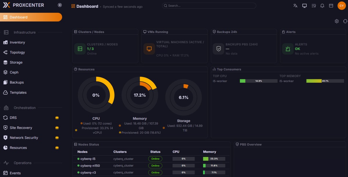 設定連接完成後,就可以登入你的 ProxCenter 管理介面,來維運你手上的 PVE 虛擬化環境叢集,以下是 CyberQ 的 PVE 叢集實例。