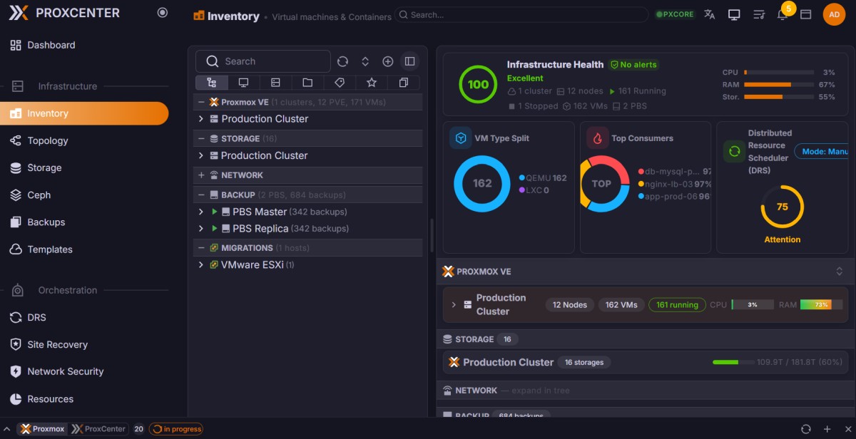 這或許是許多系統架構師最渴望的功能。ProxCenter 在企業版中導入了專屬的編排器(Orchestrator),支援自動化資源調配與 DRS(Distributed Resource Scheduler),能根據即時的負載狀況智慧地遷移虛擬機(VMs/LXC),確保硬體資源的最佳化利用。