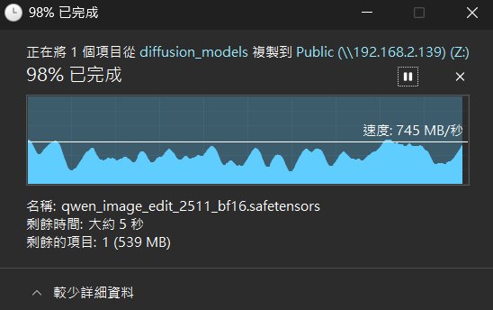 我們實際透過 10GbE 網路,在 Windows 環境下將一個高達數 GB 的 AI 模型權重檔(眼尖的同好應該有發現,檔名是熱門的開源視覺大模型 qwen_image_edit_2511_bf16.safetensors)直接丟進掛載 S300 AI 的 NAS 中。