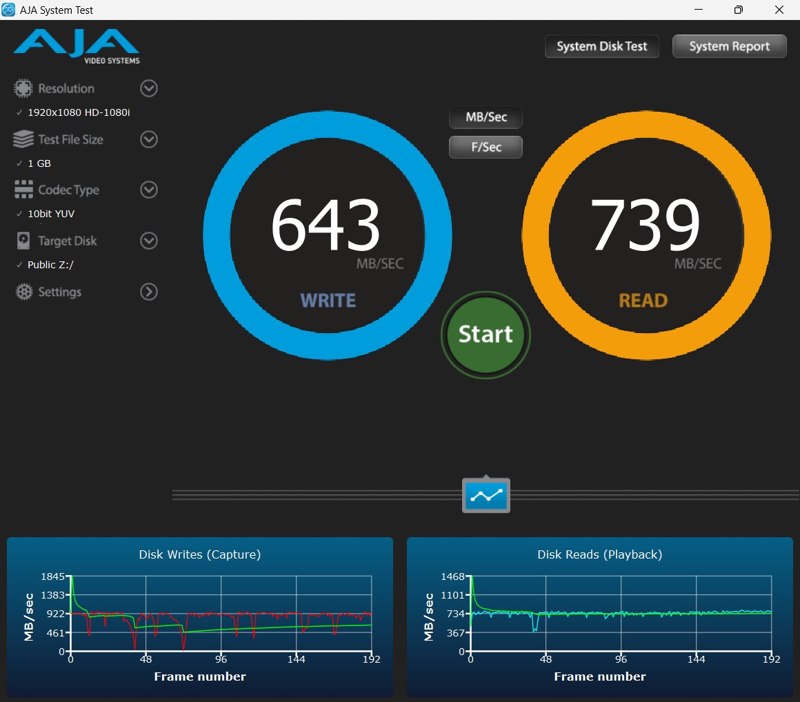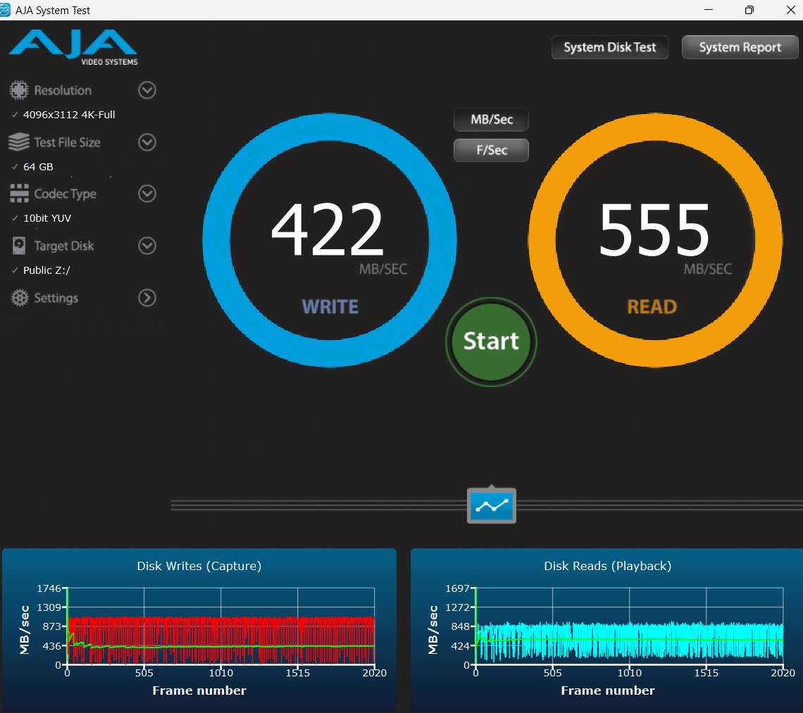 為了模擬的多路高畫質連續寫入,除了前述的跑分軟體、QNAP QVR 實測錄影外,也請出好萊塢影視工業標準的 AJA System Test 來進行測試,也另外在這個軟體項目中做了一組「1GB vs 64GB」的對照實驗。