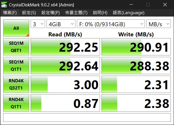 首先將單顆硬碟接上測試桌機的 SATA 埠。在 CrystalDiskMark 基準測試中,實測結果還不錯,連續讀取達到了 292.25 MB/s,連續寫入也高達 290.91 MB/s,在機械硬碟中屬於頂級水準。