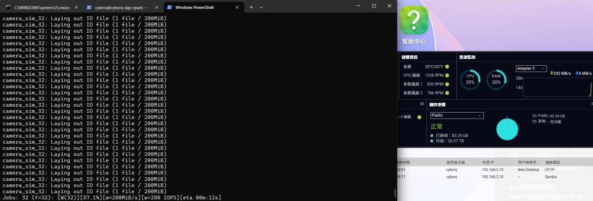 在這種連續高壓寫入 + AI 隨機讀取的環境下,S300 AI 的 OptiFrame AI 技術與 512MB 大快取有發揮效果。我們觀察到 NAS 的 I/O 延遲依然保持在夠低的水準,DGX 端獲取的影片流沒有出現掉畫面(Frame Drop)或破圖的狀況,符合官方宣稱的 32 道 AI 串流支援能力。