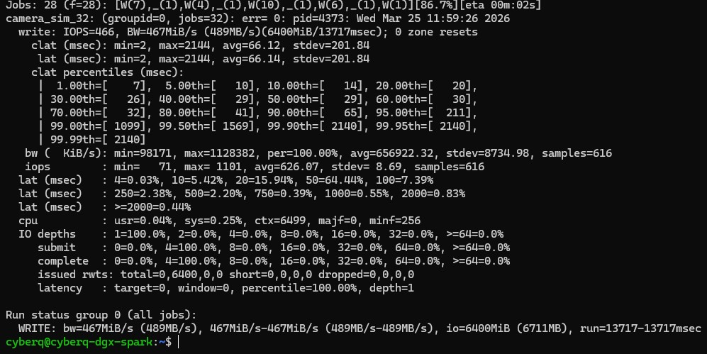 在 DGX Spark 上,跑 FIO 的測試,32 路寫入硬碟速度來到 489 MB/s,已經是 4 顆傳統機械硬碟組 RAID 5 的絕對物理極限。在 DGX Spark 的 10GbE 環境下,網路已經快到硬碟來不及寫了,如果是多 Bay NAS 機型,就可以寫滿更高的速度。