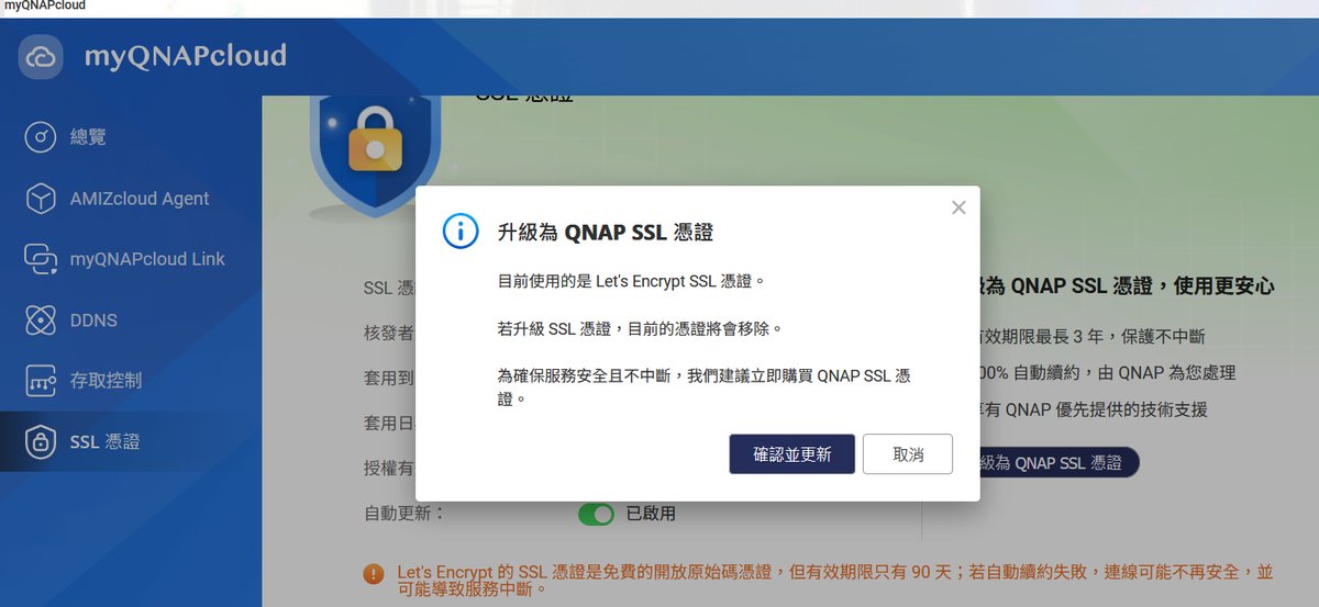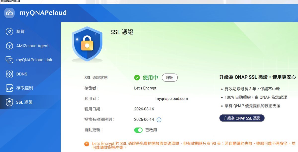 許多使用者初期會依賴免費的 Let’s Encrypt 憑證,但其有效期限僅有 90 天。從最新的 myQNAPcloud 介面中可以看到,系統現在會貼心加上醒目的提示,提醒使用者若自動續約失敗,連線可能不再安全並導致服務中斷。這種情況確實是可能發生的,因此我們通常在設置內部伺服器安全性憑證服務,以及網站的安全性憑證時,都會設法做到 90 天自動更新的 ACME 機制是順暢的,有的機構還會準備雙重憑證,萬一發生憑證沒更新還可以再最短時間內手動切換憑證。