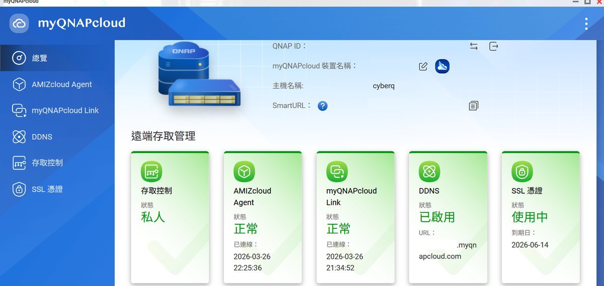 遠端存取管理儀表板繼續以清晰的卡片式設計來呈現,包括「存取控制」、「AMIZcloud Agent」、「myQNAPcloud Link」、「DDNS」以及「SSL 憑證」的運作狀態,各項服務是否正常運作、到期日為何皆一目了然。
