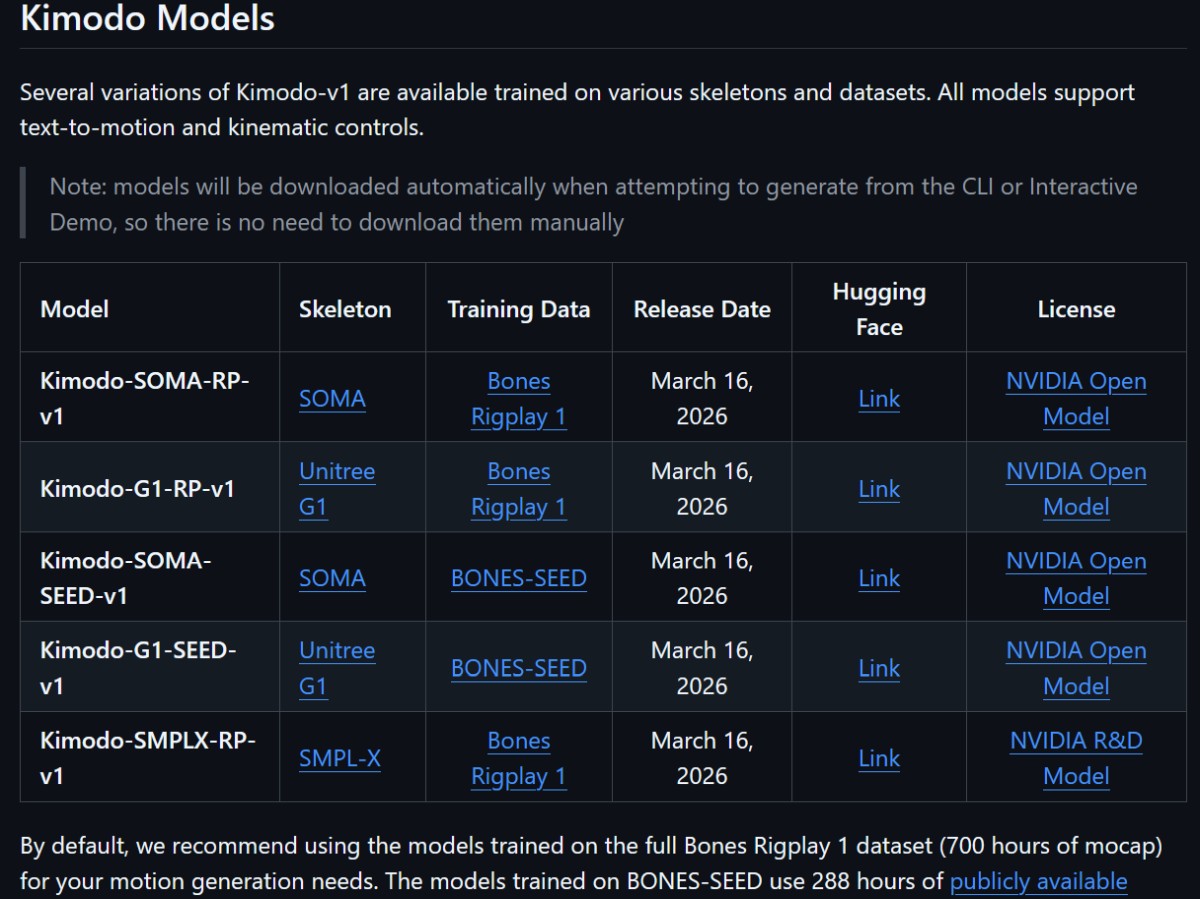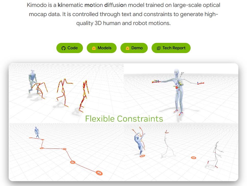 NVIDIA 空間智慧實驗室(Spatial Intelligence Lab)近期發布的 Kimodo 專案,是基於運動學的動作擴散模型(Kinematic Motion Diffusion Model),Kimodo 在 GitHub 上釋出不久便迅速累積超過 1,400 顆星,受到AI 與機器人相關開發者的關注。Kimodo 能夠透過文字提示與運動學約束條件,生成高擬真度的 3D 人體與機器人動作。