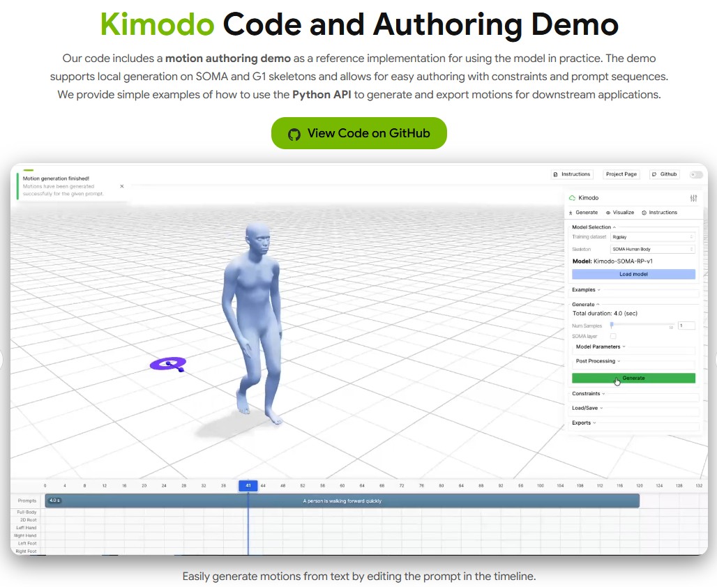 從 AI 工具程式開發的視角來看,Kimodo 提供了非常完整的開源生態。其 GitHub 儲存庫內建了基於 Web 的互動式介面(Interactive Demo)與 CLI 工具,並原生支援 SOMA、Unitree G1 與 SMPL-X 等多種骨架格式。開發者可以透過直覺的時間軸介面,編輯文字提示與約束條件,並即時預覽 3D 渲染結果。