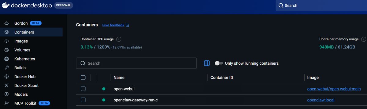 我們將 Open-Webui + Ollma 分別用 Docker 和官方版 .exe 程式安裝跑起來,再透過 git OpenClaw 官方版安裝檔案,執行 docker 腳本,進行 OpenClaw 在本地端 build 進入容器化,就可以在 Docker Desktop 中看到 OpenClaw 有跑起來了。