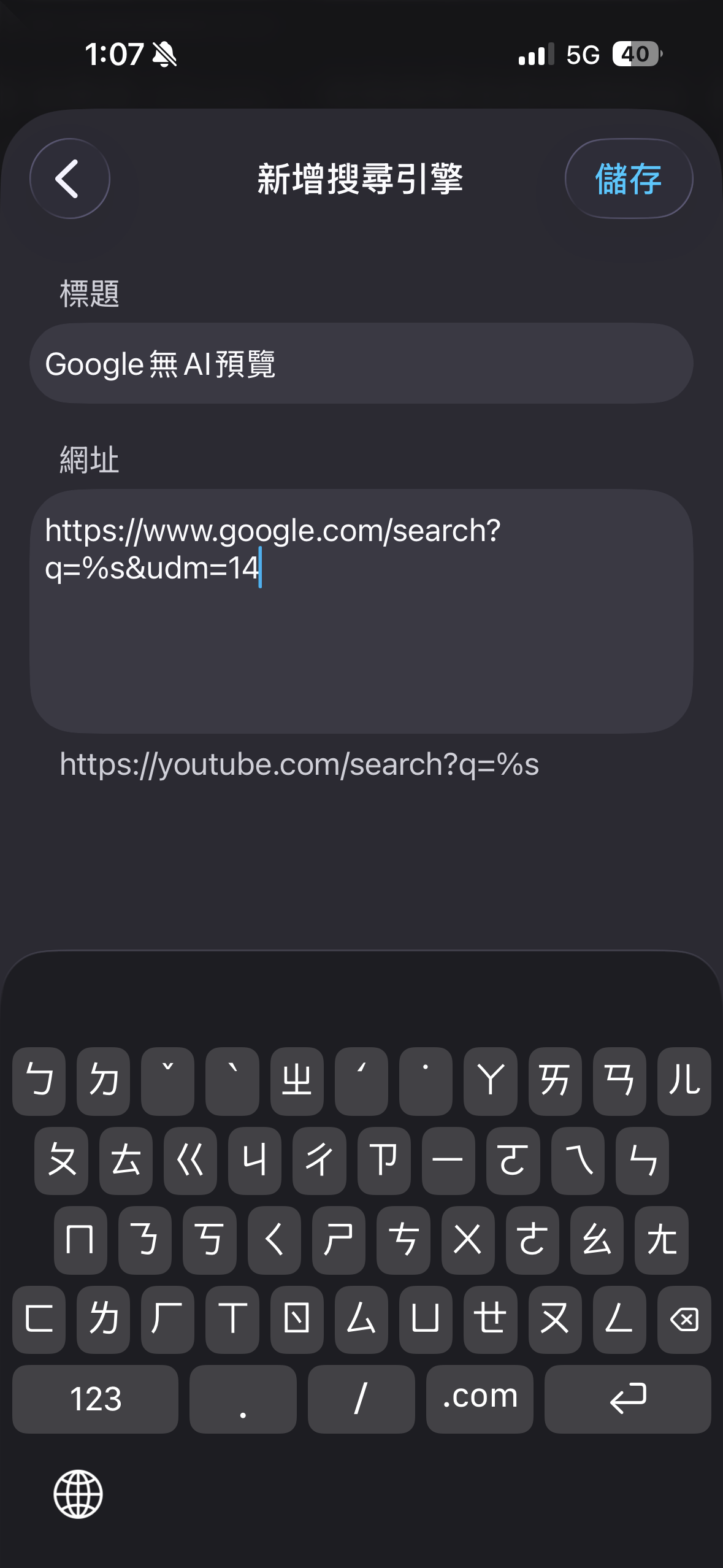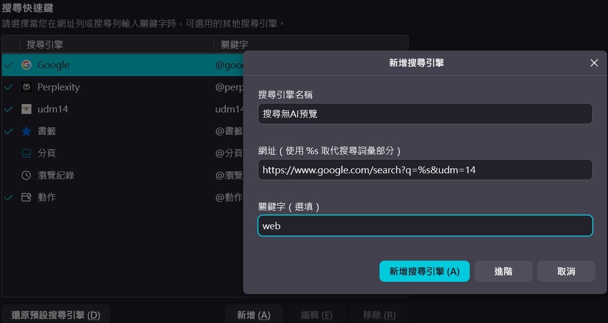 同樣的原理也是修改瀏覽器的預設搜尋引擎,語法貼上後,確認搜尋引擎改成Google無AI預覽版即可。