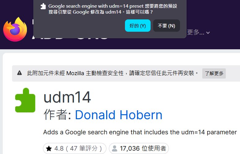 強烈推薦直接安裝這款輕量級擴充套件 udm14 (點此前往 Firefox Add-ons 下載)