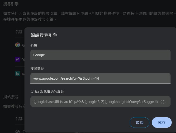 如果不喜歡安裝太多擴充功能,希望在 Chrome 與 Firefox 等瀏覽器中一勞永逸地解決問題,可以直接透過修改「預設搜尋引擎」的網址參數來達成。這項技巧的核心是將搜尋請求強制重新導向至「純網頁模式」。