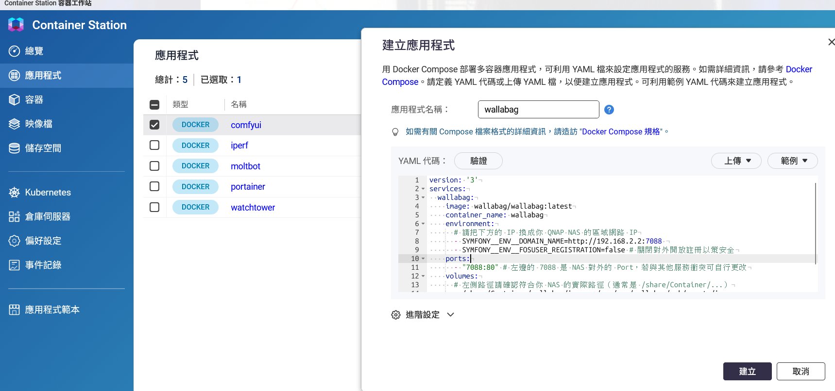 強烈建議透過 Container Station (Docker) 來部署 Wallabag。這不僅隔離了環境確保系統安全,未來備份也只需針對掛載的資料夾進行處理。