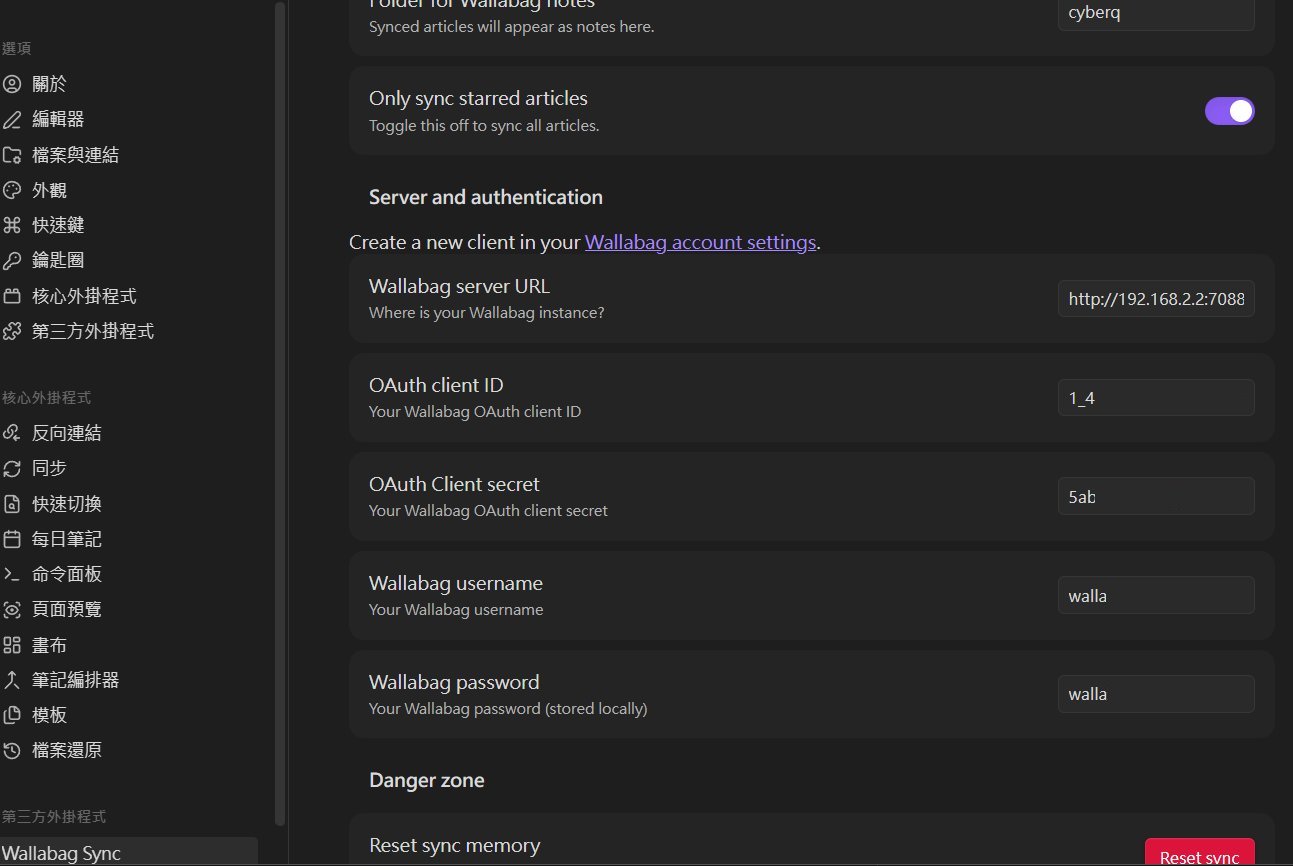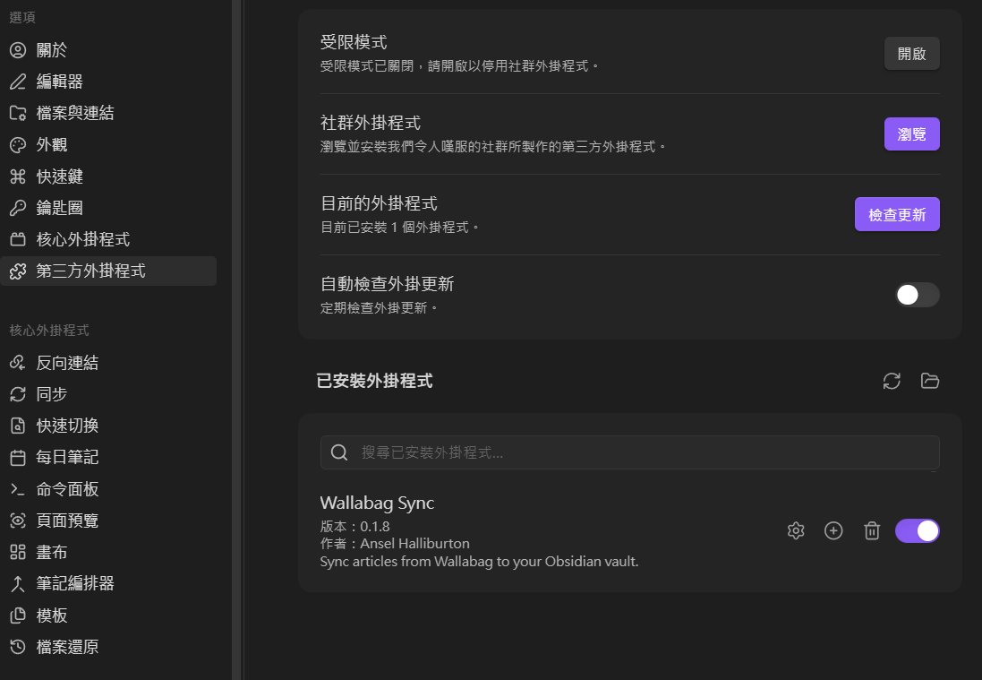 回到 Obsidian,重開程式,到「設定 > 第三方外掛程式」列表中,你就會看到 Wallabag 出現了,將其啟用即可按照填寫 API 填入同一組在 Wallabag 中建立好的 API 憑證,設定好 Markdown 範本,就能一鍵將 Wallabag 中的文章與重點同步回本機的 Obsidian 知識庫中。