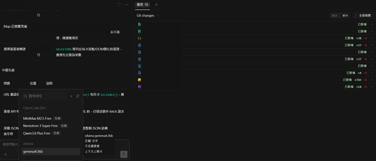 以 Windows 版本的 OpenCode 來說,同樣能夠指定跑在本機的 AI 模型平台,如 Ollama,就可以指定跑 Qwen、Gemma4 之類的模型來進行程式開發的 AI 輔助工作,找到能夠跑的模型,進行簡單的除錯與最佳化程式碼等等的協助。