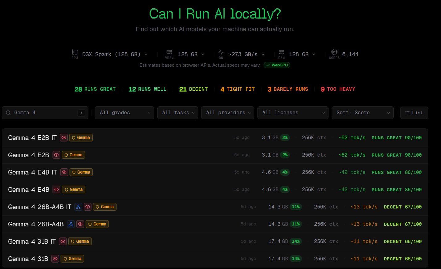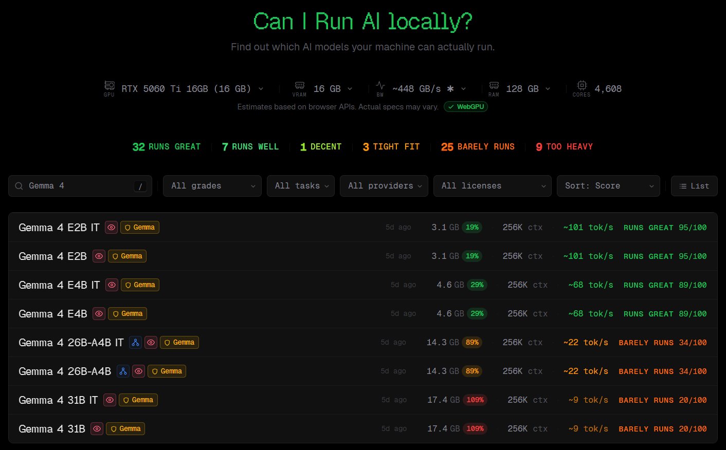 在過去你可能需要去各大論壇爬文、自己計算 VRAM(顯示記憶體)、研究艱澀的量化格式(Quantization)來做判斷。但現在呢,一個爆紅的免費網頁工具 CanIRun.ai 完美解決了這個問題,CyberQ 根據實作經驗評估過這個網站,它確實有做了很好的整理,連最新的 Gemma4 模型的評估資料都有,我們可以很快地用手邊的硬體規格在這網站查詢能不能夠順利執行相關模型,CyberQ 也根據這網站的資料,彙整出硬體的實測效能表格提供各位參考。