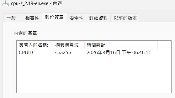 記得查驗數位簽章,在執行任何系統工具之前,請務必右鍵查看檔案的「內容」>「數位簽章」。正常的軟體應具備 CPUID 的有效簽章,若發現簽章遺失或發行者名稱怪異,應立即刪除。
