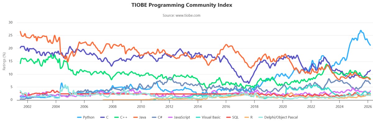 曾經在 2000 年代初期有高市佔率的 Java,在近期的榜單中持續下跌到第 4 名,創下了自 2001 年 TIOBE 榜單創立以來的歷史最低名次。儘管 Java 在大型企業系統中依舊龐大,但新創專案的採用率正在受到其他現代化語言的挑戰。