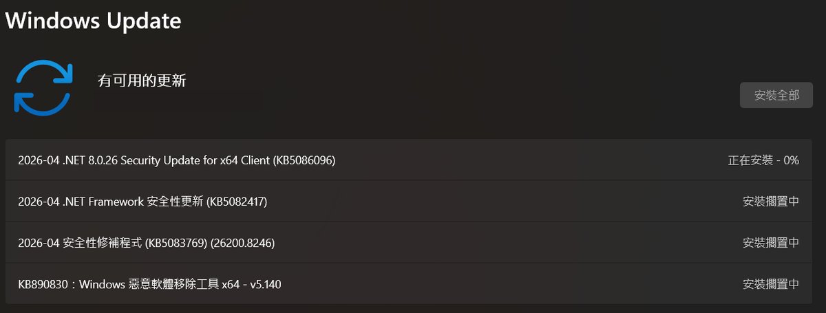 除了 4 月的 Patch Tuesday 更新外,微軟也釋出了以下 .NET 更新,許多知名 Windows 應用程式皆依賴 .NET 執行,這次釋出了包括 2026-04 .NET Framework 安全性更新 (KB5082417)、 2026-04 適用於 x64 用戶端的 .NET 9.0.15 安全性更新 (KB5086097) 2026-04 、適用於 x64 用戶端的 .NET 8.0.26 安全性更新 (KB5086096)。