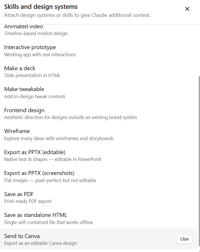 在這樣的情況下,我們就能夠進行無縫接軌開發與生態協作,除了支援匯出為獨立 HTML、PDF、PPTX 之外,Anthropic 更與 Canva 達成深度整合,支援將設計一鍵匯入 Canva 進行跨部門的圖層編輯。此外,它提供了殺手級的一鍵交接(Handoff to Claude Code)功能,能將設計打包,直接交給自家的寫碼 AI 助理進行前端程式碼實作。
