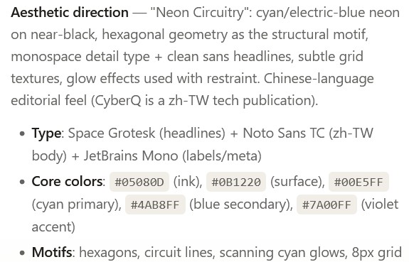 CyberQ 透過 Anthropic Claude Design 進行實作 ,這也是該公司同步發表的最新模型 Claude Opus 4.7 所驅動的平台,它完全跳脫了傳統提示詞生圖(Prompt-to-Image)的範疇,變成深度融入真實軟體開發的工作站。