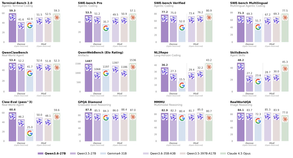 根據官方提供的測試資料,Qwen3.6-27B 效能超越了體積是其約 15 倍的前代開源旗艦模型 Qwen3.5-397B-A17B (397B 總參數 / 17B 活躍參數):