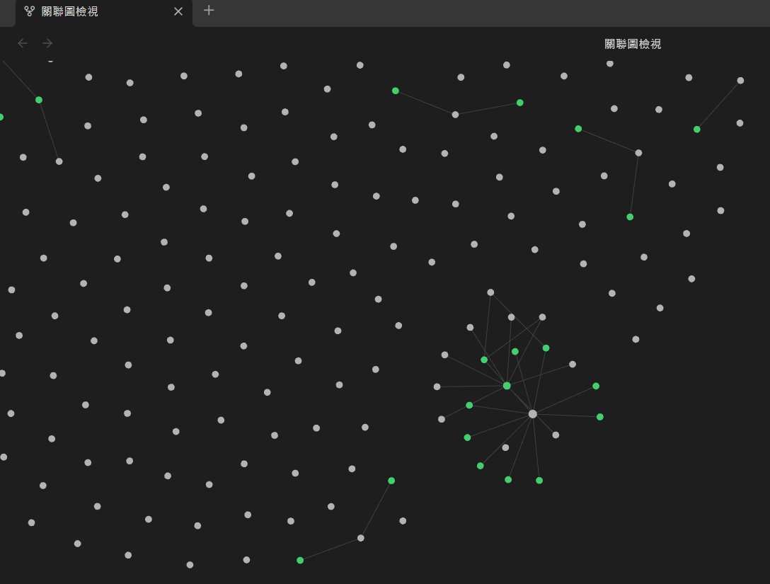 此時再切換到 Obsidian 的 Graph View,就會看到原本散落的文章逐漸變成彼此連結的知識網路。
