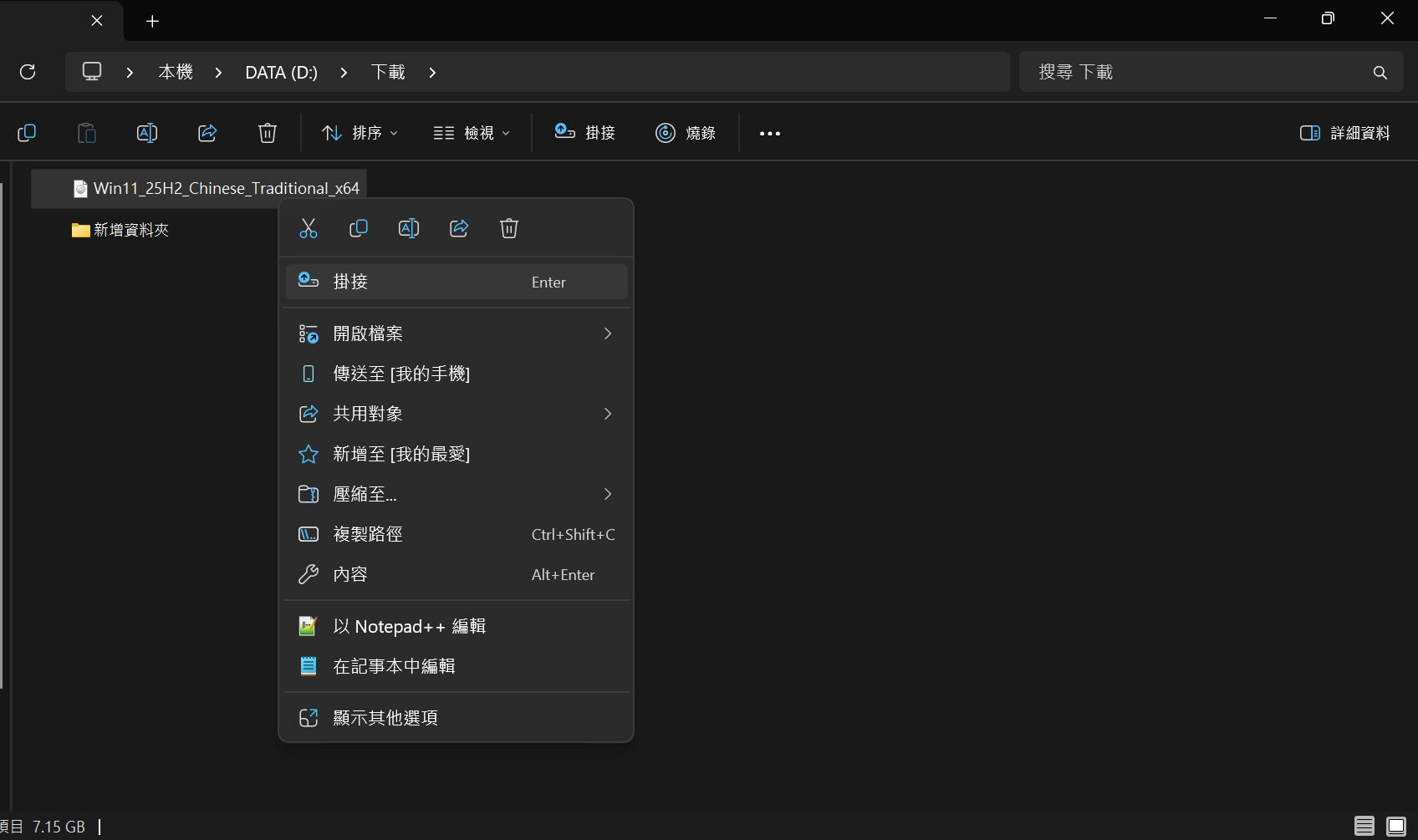 找到下載好的 ISO 檔(例如 Win11_25H2_Chinese_Traditional_x64)。
